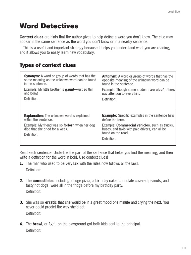 Context clues example sentences there are thousands of words in any language. Teaching the context clue approach to meaning. Definition or explanation clues this is the simplest form of context clue where the literal meaning of the word is given to the reader but in the form of explanation.
