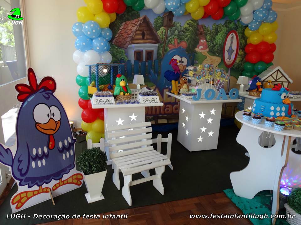 A festa galinha pintadinha e um classico entre as criancas e uma maneira diferente de fazer o tema para as meninas e adotar a decoracao em tons de cor de rosa. Se voce quiser incluir os outros personagens na decoracao pode utilizar o rosa e roxo da borboletinha e do galo carijo o verde do sapo e o amarelo do pintinho amarelinho. O ponto alto da decoracao de festa galinha pintadinha e utilizar bolas azuis com estampa de poa branca que tem tudo a ver com a personagem.