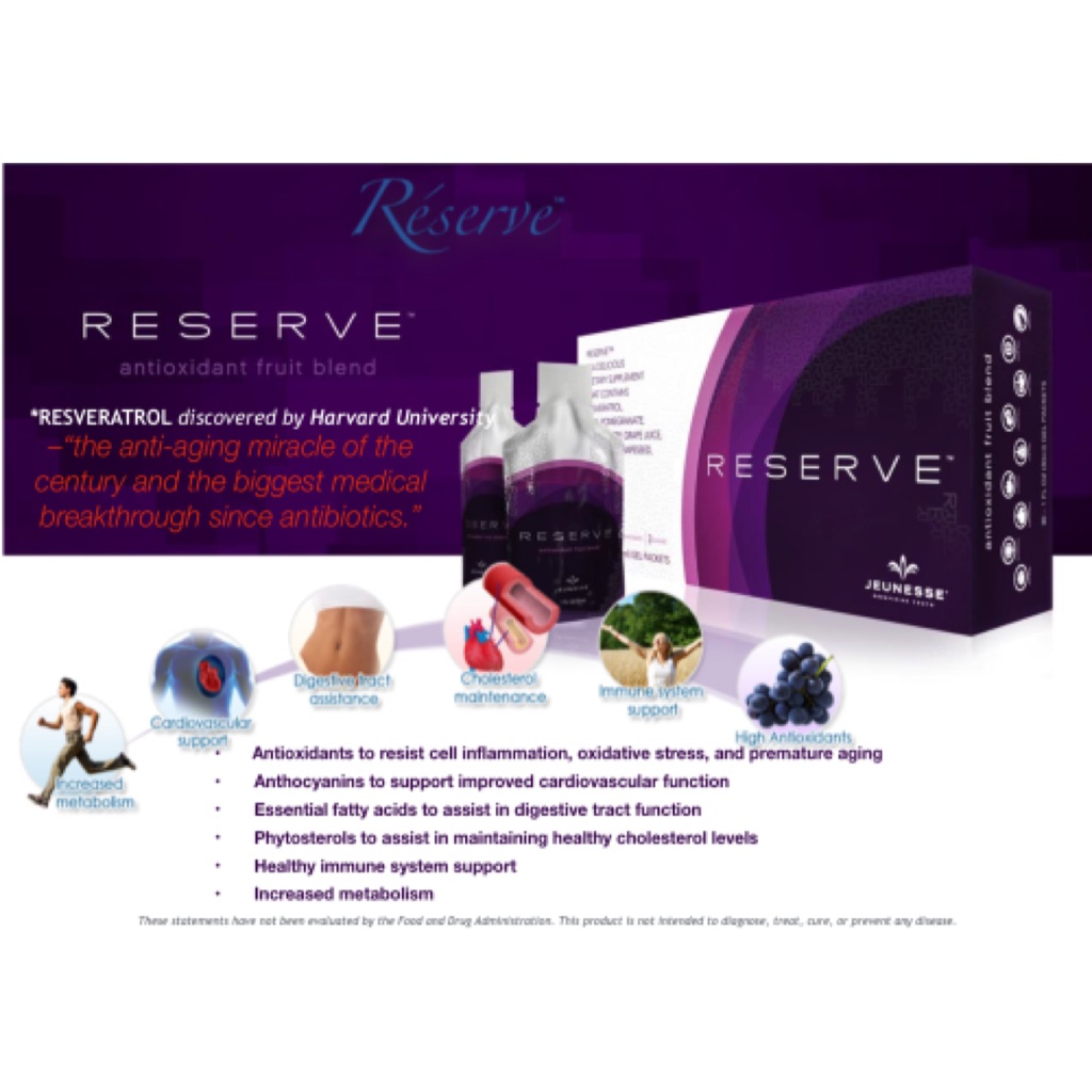 Jeunesse reserve has been formulated using a delicious blend of fruit juices and botanical extracts selected for their powerful abilities to improve your overall wellbeing. It is a resveratrol supplement used by people who want to add more antioxidants and fruit concentrate into their diets. Information and statements regarding dietary supplements have not been evaluated by the food and drug administration and are not intended to diagnose treat cure.